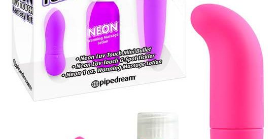 The Neon Luv Touch – Fantasy Kit is ideal for the busy bees amongst us. This is the kind of kit you can tuck into a make-up bag at the bottom of your handbag, take with you on a weekend away, or even just have at the ready in your bedside drawer. You’re guaranteed pleasure with two brilliant toys, and the experience is made even sweeter with the included massage lotion. Mini Bullet – this is an innocent looking piece, but you know the truth, this is a tapered mini vibe that’s ideal for clit stimulating fun. Approximately 5.5cm long, you can tuck this little goodie into purses and pockets without the slightest suspicion. The rounded point of this mini bullet allows for precise focus of the vibrations, delivering pleasure to just the right spot. Adding to this, the rounded, smooth body of the bullet feels great when held against the body, allowing for the vibrations to tickle and stimulate your sensitive lips and folds. G-Spot Tickler – this is a one speed wonder, a small 12.5cm vibe that features the perfect little point for stimulating those bundles of nerves hidden inside your vagina. The G-spot stimulator is easy to turn on, just give it a little twist and you’re rumbling away. While this doesn’t pack the features of a larger, more expensive wand or rabbit, this is the ideal kind of vibrator for pleasuring yourself while on vacation, staying somewhere with a partner, or –dare we say it – for a quick O in the office. Warming Massage Lotion – lush and smooth, this is a lovely lotion to rub against your sensitive regions. The warming lotion helps set the mood, and makes using toys even more enjoyable. The small and secure bottle is easy to store, and small enough to go in over-head luggage without a fuss. All in all, making this a good kit for any woman – at home or on the move!No picture can ever do the Neon Luv Touch vibes justice, they’re the perfect mix of bright bubbly colour with smooth, inviting body-safe materials. Neon Luv Touch Mini Bullet Neon Luv Touch G-Spot Tickler 29mL of Warming Massage Lotion Compact and Fun
