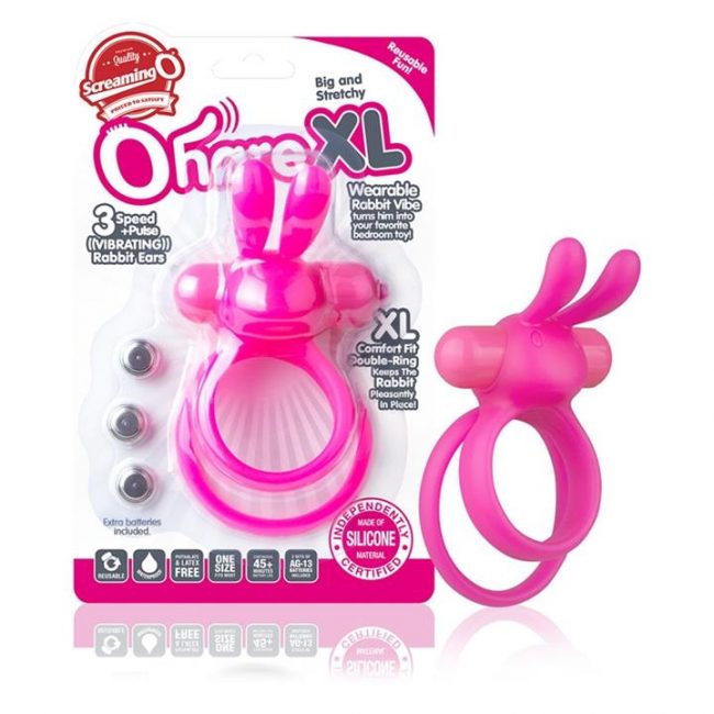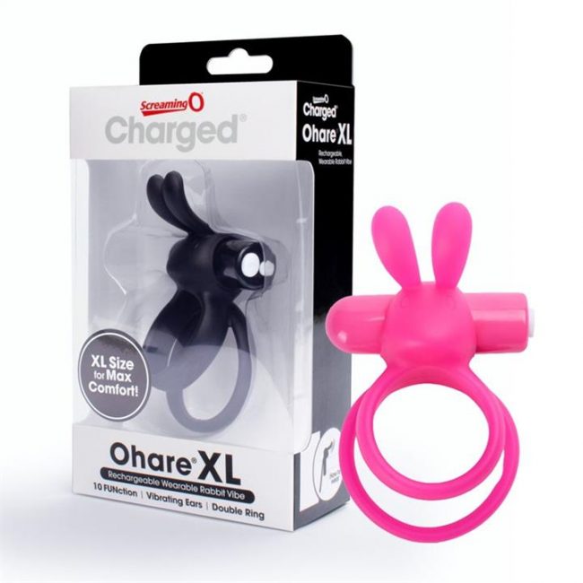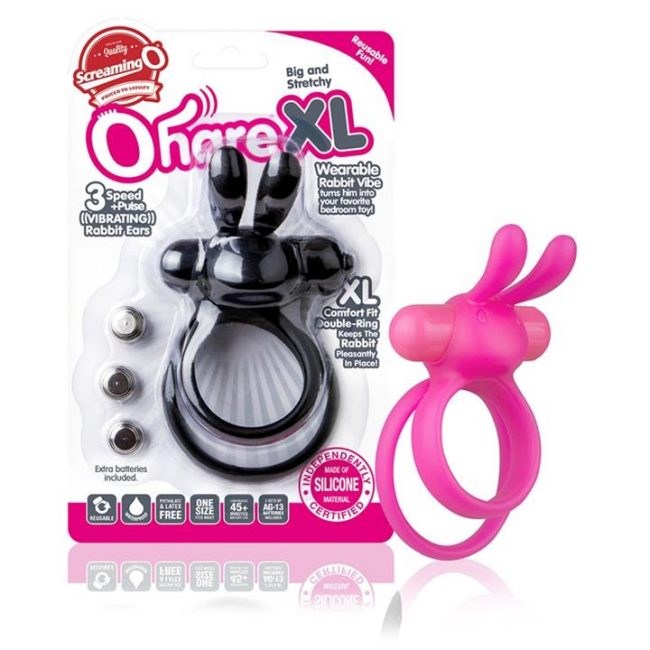 Ohare XL by Screaming O is a fun cock ring for him and her with a wonderful and cute little bunny ears to tickle and delight. Ohare XL Cock Ring with Vibrating Bullet you may have tried the Ohare previously and found that you may want or need a little more room and that’s why we have the XL size. The Ohare is designed with 2 rings not just 1, with 2 you can use it around your cock and balls or both around your cock delivering more pleasure in more ways. The wonderful little bunny ears vibrate and are ready to tease, oh how I love a tease. 3 Vibration Settings via the bullet inside the Ohare, which is also removable. Easy to use with just one button to select the desired level of vibrations. Soft Stretchy Silicone Material to make sure that it stretches for you to put on the goes back to that snug hug feeling that is required with a cock ring. 2 Fun Colours with Black and Pink Ohare XL by Screaming O is the super-duper size for those who have extra junk in their trunk and want to get their bunny on with the Ohare vibrating cock ring. Ohare XL Cock Ring with Vibrating Bullet 3 Vibrations Settings Soft Stretchy Silicone Material 2 Cool Colours