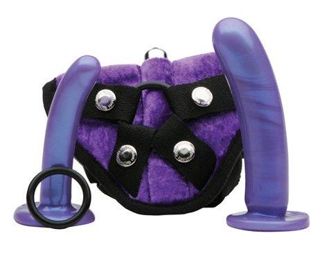 The Tantus Bend Over Beginner Kit has two smooth 100% silicone dildos, 2cm x 11cm and 3cm x 13cm so you can pace your exploration with comfort and safety. The kit features a purple velvet harness which is comfortable, adjustable (fits up to 60" hips), and machine washable. It also comes with an O-ring that can be changed for play with larger dildos as well as a pocket built in that fits a Variable Speed Micro-Mini Vibe (included).The pocket holds the vibrator in place and allows access to the controls throughout your strap-on experience. Hypoallergenic Hygienic No Smell No Taste Boilable Bleachable Comfortable Adjustable Fits up to 60" (152cm) hips Pocket for Vibrator (included) Washable Includes two sizes of O-rings A strapon kit perfect for the beginner.  It features a plush purple harness with a in-built pocket for a sneeky bullet vibe for pleasing the wearer while the receiver will have the choice between two silicone dildos for their pleasure.  Its pleasure and stimulation for all involved.
