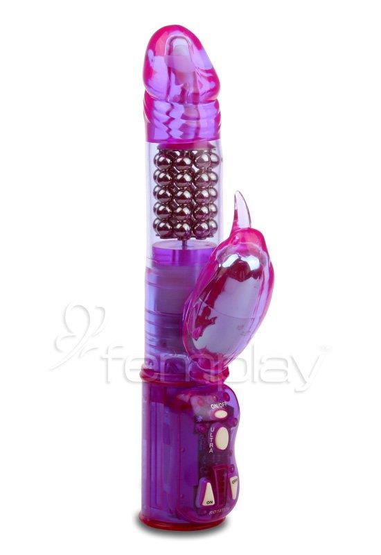Ultra-fit adjustable nylon straps holds the venus in place for a firm fitting pleasure that snaps on and off quickly. Soft pink butterfly strap-on clit vibrator with 4" veiny penis that rotates up to 5 speeds! Powerful hand held easy-slide controller with 2 five stage LED indicator lights for quick changing multi speed rotation and vibration. Includes over 2ft. of flexible wire so you can control the action from any place or position that you want – even under your clothes! Very nice little strap on butterfly stimulator! I love the rotation of the penis which is quite mild, but helps stimulate the g-spot. The base of the butterfly vibrates to stimulate the clitoris, and is fully adjustable.
