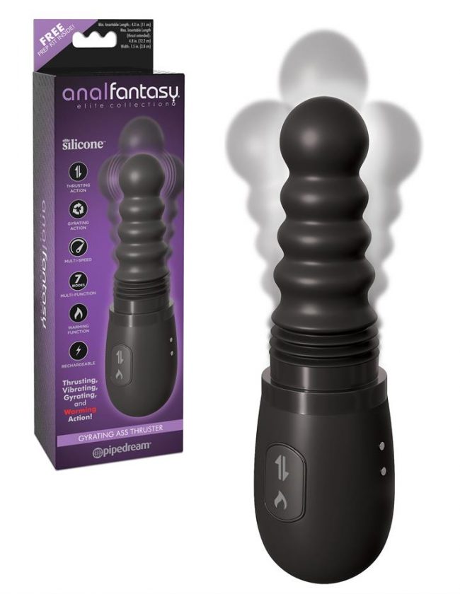 The Anal Fantasy Elite – Gyrating Ass Thruster has so much to offer for anal pleasure, with so many enjoyable functions you will be in bum heaven. Gyrating Ass Thruster ooohhh, doesn’t it already sound pretty good. It’s a compact thruster with a full length of 21cm which makes it quite a comfortable vibe to hold in one hand. The insertable length starts at 11cm to 12.2cm with a decent width of 3.8cm. It thrusts and gyrates with sheer anal delight. Muliple Speeds and Functions which are easy to select and go through by the press buttons on the handle of the vibe. Warming Function really gets the bum warm and tingling with heat up to 40 degrees. USB Rechargeable which always makes for a good vibe as you don’t need to buy batteries and you receive extra power. Silicone Shaft makes it smooth and a delight to play with. The shaft has a cover to protect your vibe and you also receive a starter pack with a glove and lube. Anal Fantasy Elite – Gyrating Ass Thruster has all the action you need for full asstastic pleasure, including thrusting and warming sensations. Gyrating Ass Thruster Multiple Speeds and Functions Warming Function USB Rechargeable Silicone Shaft