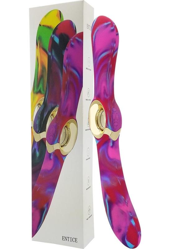 Double the enjoyment with the Entice Vibrator Camo vibrator has everything you can want in a double vibe. Entice Vibrator with a great length of 12.5cm for the G-Spot side and 10cm for the curved end and 3.5cm diameter makes this a wonderful sized toy. 10 Vibrations with Independent Controls that are easy to use with touch buttons and a centre handle to make it easy and comfortable. 5 Intensity Levels which again are independently controlled with the easy control buttons. Flexible Shaft so that you can get the right angle for the pleasure that you’re looking for. Silicone Material makes it smooth and sexy. Entice Vibrator Camo – Pink well it’s not just pink it’s multi-coloured with pink,rose, purple and blue colours. It’s a poweful silicone double vibe that’s sure to surprise. Entice Vibrator 10 Vibrations with Independent Controls 5 Intensity Levels Flexible Shaft Silicone Material